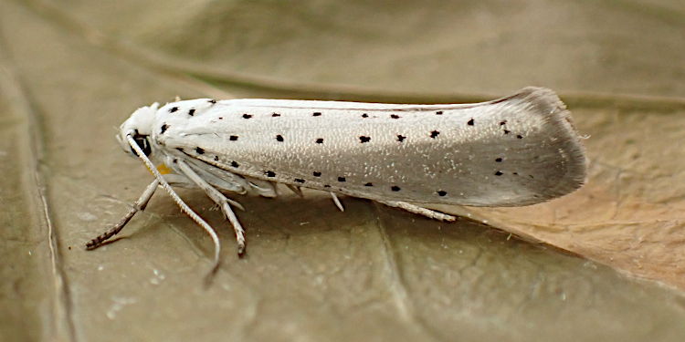Apple Ermine Y. malinellus, but grey wash generally restricted to dorsal half of forewing: if this is not clear, then records need to be aggregated as 'Yponomeuta sp.' Larva feeds on White Willow and Goat Willow, living gregariously within a silken web.