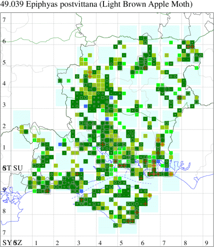 Common in gardens throughout much of the country. Thoroughly naturalised, through accidental introduction in garden plants, this native of Australia was first reported in Britain from Cornwall in 1936, it has since expanded its range across most of the country, and can be abundant where it occurs. Shows a marked preference for urban gardens, remaining relatively rare away from towns, and despite its common name, is neither light brown, nor particularly fond of apple! Widespread and common in Hampshire and on the Isle of Wight. Wingspan male 16-21 mm, female 17-25 mm. The male is usually distinguished by the abrupt division of the forewing medially into a pale basal area and darker apical area, and the female by its large size and relatively elongate forewing, often with greatly reduced markings [Bradley]. Larva polyphagous on a wide range of plants, including Evergreen Spindle, causing sufficient damage to fruit trees to be a serious pest in some areas.