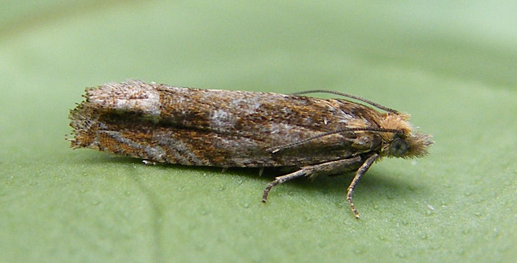 Common in hedgerows and woodland throughout much of the British Isles, favouring low-lying areas. In Hampshire still fairly common, especially in the south-east, with scattered records in the north, but largely absent from the New Forest and on the Isle of Wight, where there are only two recent records. Wingspan 12-16 mm. Well-marked specimens are characterised by the well-defined basal patch, which is angular medially and broadly edged throughout with the light ground colour, and the median fascia being more or less edged throughout distally with plumbeous strigulation; in dark or almost unicolorous specimens this plumbeous strigulation is still evident [Bradley]. Larva feeds on buds of Elm, revealing a highly distinctive arc of holes, subsequently living within a spun leaf.