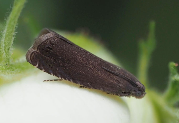 Common in allotments, market gardens, farmland and rough ground throughout much of Britain, more numerous in the south; rare in Ireland. In Hampshire and on the Isle of Wight until recently a familiar sight in garden peas but now quite rare in some areas. Wingspan 12-16 mm. Distinguished by the overall uniform brown or grey-brown appearance of the forewing, which is finely irrorate with pale ochreous distally and has a poorly developed ocellus and usually conspicuous costal strigulae and interspaces; in the hindwing the white or cream-white cilia are characteristic and contrast strongly with the dark fuscous coloration of the wing; the male is further distinguished by the presence of a dorsal fold along the inner margin [Bradley]. Larva feeds within pods of Pea, Sweet Pea and Common Vetch, causing sufficient damage to be a serious pest in some areas, over-wintering in a silken chamber.