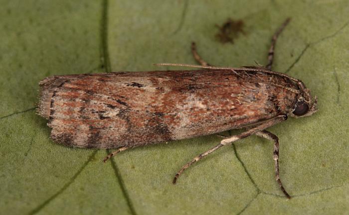 Common in oak woodland, deciduous woodland and areas with scattered trees throughout much of England; rare in Ireland. In Hampshire and on the Isle of Wight the commonest phycitine throughout much of the region, and one of the easiest to identify. Wingspan 24-29 mm. Easily recognised by the reddish admixture of the forewing, together with the broadly triangular dark patch before first line [Goater]. Larva feeds on Oak, living between leaves spun together with silk.