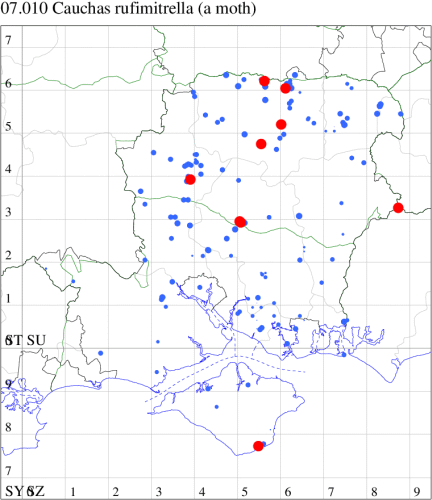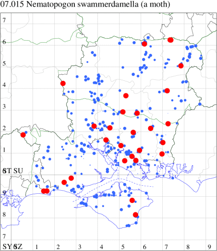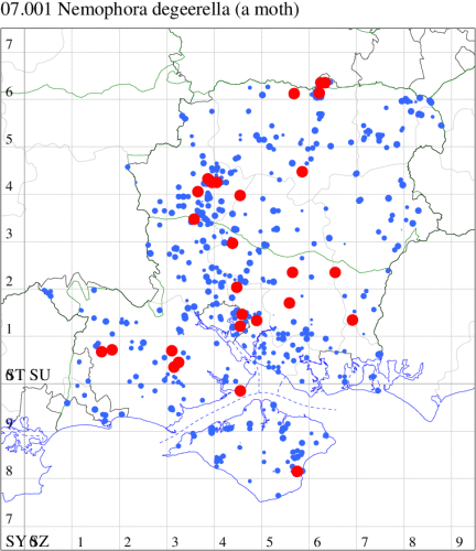 For the maps, all records prior to 2024 are shown by a blue dot (the larger the dot, the more recent), with the current year's records shown in red. As previous records are superimposed on any report for 2024, new sites have greater emphasis (i.e. will show as 'more red').