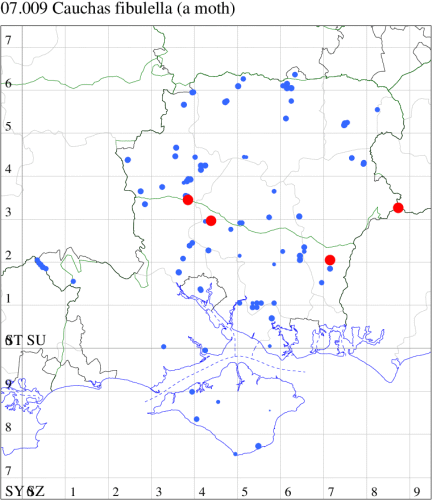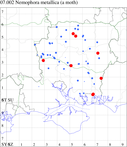 VC11: Romsey, two, 07 Jun; one, 09 Jul (NRJ); Swaythling, Southampton, one, 01 Jun; one, 03 Jun (MEdg); Allbrook, one, 30 May (SIng); Titchfield Common, one, 17 May (F.M.G.); Funtley, one, 11 May (TDC); Fareham, one, 29 Jun (MLO); Botley, one, 28 May (SLB); Dean, Bishop's Waltham, present, 10 Jun (CMor); Wickham, one, 21 May (JRDS); Waterlooville, one, 07 May; one, 12 May; four, 14 May; one, 19 May; one, 22 May; one, 25 May; one, 29 May; one, 04 Jun (DWhe); Old Winchester Hill, two, 31 May (F.M.G.); Horndean, one, 03 Jun (PHog); Stroud, Petersfield, two, 17 Jun; one, 19 Jun (RAll); Christchurch, one, 29 Jun (APard); Stanpit Marsh LNR, two, 22 Jun (RPH det. PAB); New Milton, one, field obs., 20 May; Sway, one, 06 May (SKee); Pennington, one, 03 Jun (RFC);