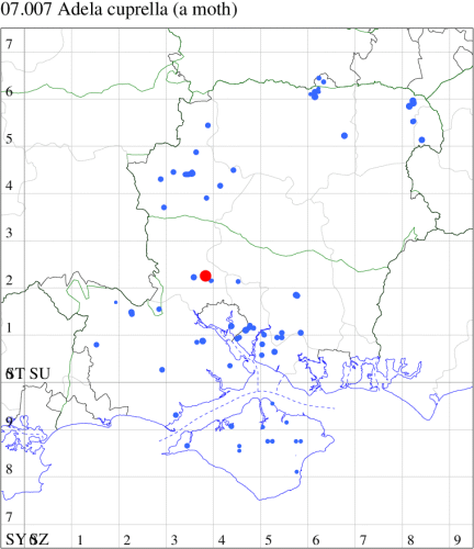 VC11: Ringwood, present, field obs., , 12 Jun (ASho); Linford, one, field obs., 15 May (IHayw); Lyndhurst, NF, present, field obs., , 01 Jun (SRC); Pignal Inclosure, NF, one, field obs., 25 May; Parkhill Inclosure, NF, 20, field obs., two leks, 25 May (SKee); Stockbridge, present, field obs., , 29 May (MFow); Sholing, Southampton, one, field obs., 28 May (PAB); Westend Copse, Southampton, 10, field obs., 01 Jun (LJoy); Wildern LNR, Hedge End, one, field obs., 11 Jun (TCrw); Crab Wood, Winchester, 12, field obs., 17 May; present, field obs., abundant, 05 Jun; present, field obs., 12 Jun (DAS); Boyatt Wood, Eastleigh, one, indoors, 15 Jun (SJon); The Moors NR, Bishop's Waltham, one, field obs., 13 Jun (DTru); The Holt, Bishop's Waltham, one, field obs., 31 May (PAB); Waterlooville, present, field obs., , 18 Jun (YEva); West Meon, one, field obs., 10 Jun (AMD); Lepe Point LNR, one, field obs., 24 May (PGS);