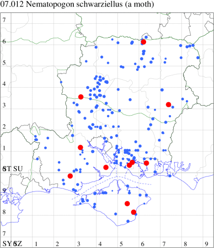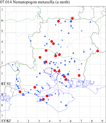 Common in deciduous, often damp, woodland throughout England and Wales. Frequently recorded and well distributed across much of Hampshire and the Isle of Wight. Wingspan 17-23 mm. Unmistakable; male has very long antennae. Larva feeds on leaf litter, living within a movable case.