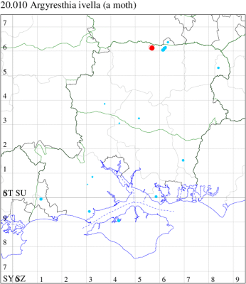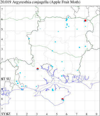 Common in hedgerows throughout much of the British Isles, except for the Highlands and Islands of Scotland. In Hampshire most frequent in the south-east of the county, with scattered records elsewhere and on the Isle of Wight. Wingspan 9-11 mm. The main confusion species are Apple Fruit Moth A. conjugella and A. semifusca, which see. Larva mines buds and shoots of Blackthorn, over-wintering as an egg.
