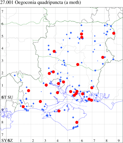For the maps, all records prior to 2024 are shown by a blue dot (the larger the dot, the more recent), with the current year's records shown in red. As previous records are superimposed on any report for 2024, new sites have greater emphasis (i.e. will show as 'more red').