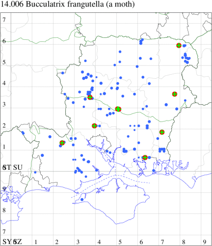 Local in fens, open woodland and hedgerows throughout much of south-eastern England, and in Yorkshire, Cumbria and on the Burren. In Hampshire it is found in boggy areas, where the foodplant is Alder Buckthorn, and on the chalk, where the larva is associated with Buckthorn. Not recorded from the Isle of Wight since 1975. Wingspan 7-8 mm. Larva mines leaves of Buckthorn and Alder Buckthorn, over-wintering as a pupa.