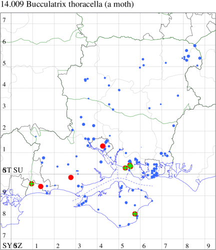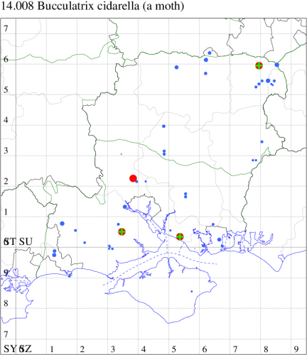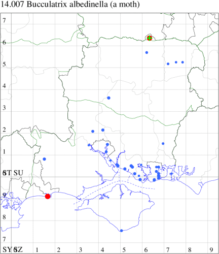 Local in scrub, hedgerows and woodland edges throughout much of England and southern Scotland. Widespread in Hampshire, although apparently absent from the New Forest in recent years, and only known from a handful of sites on the Isle of Wight. Wingspan 7-9 mm. Flies in evening sunshine. One of the less distinctive Bucculatrix species, and probably under-recorded. Larva mines leaves of Hawthorn, Pear, Apple, Rowan and Wild Service-tree, over-wintering as a pupa.