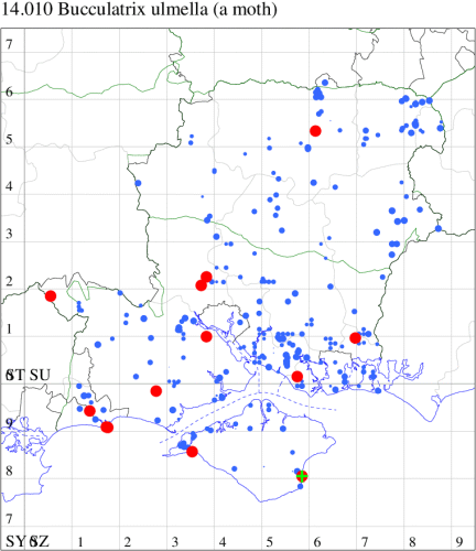 Local in hedgerows and woodland margins throughout much of southern England, with records north to Yorkshire. In Hampshire virtually restricted to the south-east, where it remains reasonably numerous around the three harbours, but very rarely recorded in north of the county and on the Isle of Wight; perhaps overlooked. Wingspan 8-9 mm. Larva mines leaves of English Elm and Small-leaved Elm, over-wintering as a pupa.