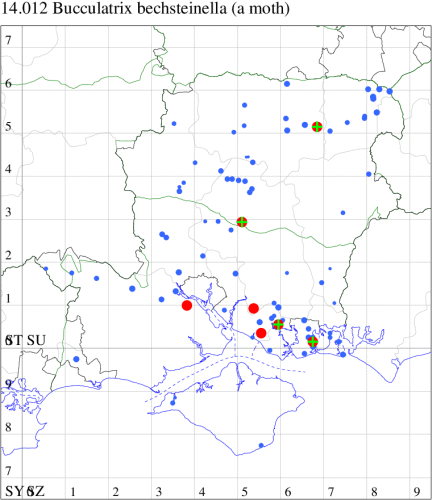 For the maps, all records prior to 2024 are shown by a blue dot (the larger the dot, the more recent), with the current year's records shown in red. As previous records are superimposed on any report for 2024, new sites have greater emphasis (i.e. will show as 'more red').