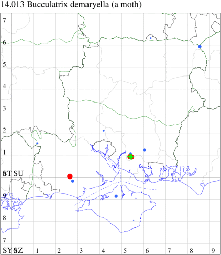 Common where there are mature oak trees, throughout much of Britain, north to central Scotland. Widespread in Hampshire and on the Isle of Wight. Wingspan 7-8 mm. One of the more distinctive Bucculatrix species. Larva mines leaves of Oak, over-wintering as a pupa.