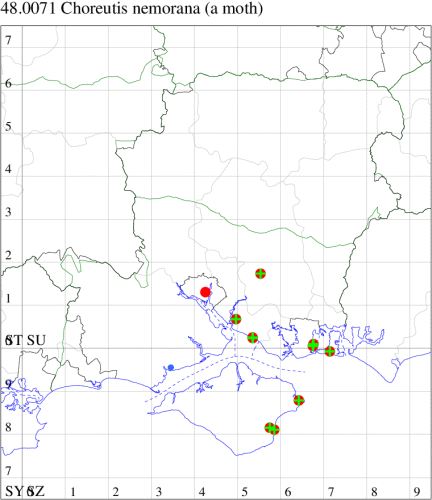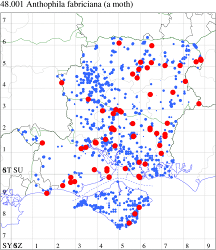 VC11: Fordingbridge, present, field obs., , 29 Jul (CDen); Beaulieu, NF, present, field obs., 12 Aug (MCrei); Woodlands, NF, one, 04 May (RBW); Totton, present, field obs., 24 May (SSto); Tanners Brook, Southampton, present, field obs., 26 Jun; present, field obs., 19 Jul (PPir); present, field obs., , 01 May (JRea); Stockbridge, present, field obs., , 29 May (MFow); Langley, one, field obs., 05 Jun; Blackfied, one, to lighted window, 25 Jul (PGS); Swaythling, Southampton, one, 10 Aug (MEdg); Wildern LNR, Hedge End, one, field obs., 03 May (TCrw); West Wood, Sparsholt, one, field obs., 23 Jun (SEG); Highbridge, Eastleigh, one, field obs., 20 Jun (MSic); present, field obs., , 20 Jun (iNat); present, field obs., 14 Sep (PPir); Winchester, one, field obs., on Hemp Agrimony, 10 Aug (THW); Stoke Park, Bishopstoke, present, field obs., 26 Sep (PPir); Titchfield Haven NNR, present, field obs., , 12 Apr (BRos); Cams Bay, Fareham, present, field obs., 08 Sep (AMD); Bishop's Waltham, one, field obs., 08 May; one, field obs., 11 Oct (DTru); The Holt, Bishop's Waltham, present, field obs., 31 May (PAB); Portchester, one, 30 Jul (DH-J); Waterlooville, one, to pheromone lure, 19 Jun (DWhe); Sustainability Centre, East Meon, present, field obs., 16 Jun (PPir); Waterlooville, present, field obs., , 18 Jun (YEva); Old Winchester Hill NNR, present, field obs., 02 Jun; present, field obs., 09 Jun (PPir); Clanfield, present, field obs., several, 03 Jun; present, field obs., 03 Jun (AMD); Stroud, Petersfield, one, 17 Jun (RAll); Hengistbury Head NNR, one, 07 Aug (HengistH det. MJef); New Milton, two, field obs., 29 Jul (RPH); Hordle, one, field obs., 02 May; one, field obs., 23 May; Sway, two, field obs., 01 May; one, field obs., 06 May; Upper Pennington, one, field obs., 20 May (SKee); Lepe CP, present, field obs., 17 Apr (RAC); one, field obs., 17 May (PGS); Gosport, present, field obs., , 03 Aug; present, field obs., , 03 Aug (iNat);