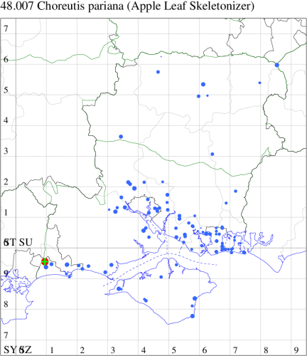 VC10: West Shanklin, pupa, present, field obs., 29 Sep (IOu); Shanklin Chine, larva, present, field obs., common, on Figs, 14 Aug (MGT); Bembridge, larval feeding signs, present, field obs., on Ficus carica. Webbing and feeding signs, 30 Jun (PBard);