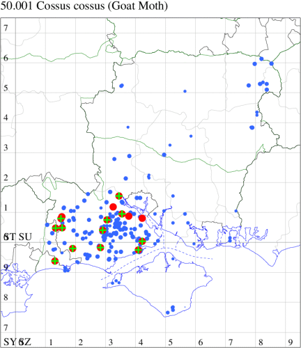 A UK BAP species in fens, marshes, river-banks, damp areas, golf courses, heaths and woodland edges in parts of the British Isles, less numerous in the north. In Hampshire and on the Isle of Wight mainly confined to the New Forest, with scattered records elsewhere. Wingspan male 68-84 mm, female 88-96 mm. The larvae feed internally in living wood or pith of a range of broadleaved trees especially those in damp areas, including sallows, willow and poplars, Ash, birches, oaks, Alder, Apple and other fruit trees, and take several years to mature. Sometimes trees in which the Goat Moth is present will be obvious, with multiple entrance holes indicating larval workings.