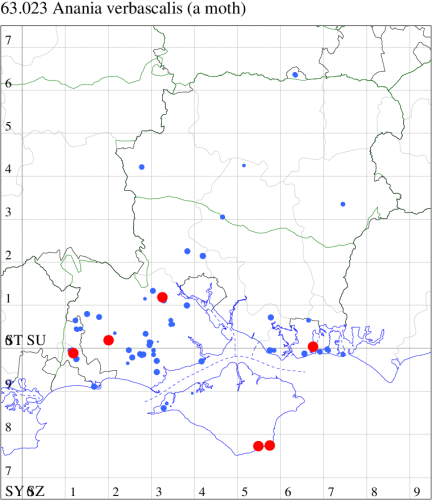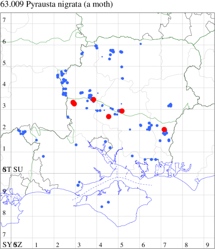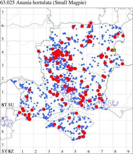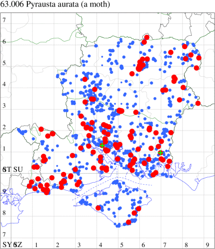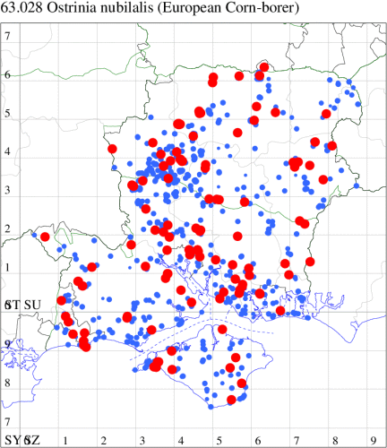 For the maps, all records prior to 2024 are shown by a blue dot (the larger the dot, the more recent), with the current year's records shown in red. As previous records are superimposed on any report for 2024, new sites have greater emphasis (i.e. will show as 'more red').