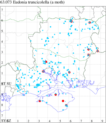 Historically associated with coastal sand-dunes and rough ground throughout the British Isles, this species in recent decades has been increasingly common inland. This picture is mirrored in Hampshire and on the Isle of Wight and it is generally regular to traps across the two counties, and is the only scopariid to be seen in winter. Wingspan 17-22 mm. Easily recognised by the narrow, pointed, brown-tinted forewing [Goater]. Larva feeds on various mosses, often on walls and sand dunes.