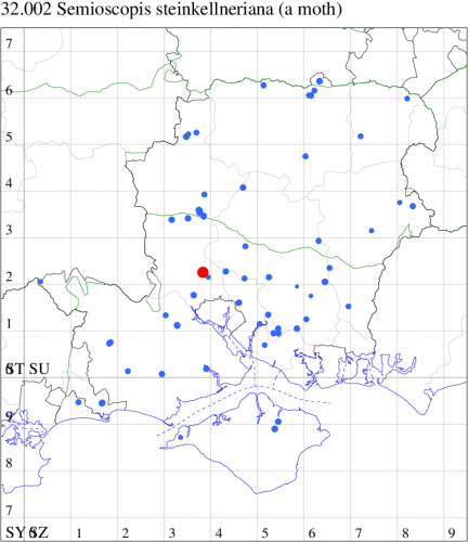 VC11: Frogham, one, 13 Mar (NTO); Hale Purlieu, NF, present, 04 Nov (JPuz); Woodlands, NF, one, 16 Feb (RBW); Timsbury, one, to lighted window, 06 Sep (RIB,DIB); Woodley, one, 07 Feb (NBin); Romsey, one, 10 Feb (NRJ); West End, one, 15 Feb (AMD); Allbrook, one, 12 Mar; one, 13 Mar (SIng); Brownwich Cliffs, Titchfield, two, 06 Sep; Botley Wood, one, det gen, 15 Mar (F.M.G. det. RJD); Botley, one, 02 Feb (SLB); Portchester, one, 03 Feb; one, 15 Mar (DH-J); West Walk, one, 02 Feb (F.M.G.); Horndean, one, 10 Feb (PHog); Burton, nr Christchurch, one, 15 Mar (JStw); Sway, one, to lighted window, hindwing photographed, 04 Feb; one, 15 Feb; two, 13 Mar; one, to lighted window, 14 Mar; one, 15 Mar; one, 19 Jul (SKee); Pennington, two, 20 Mar (RFC);