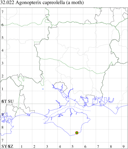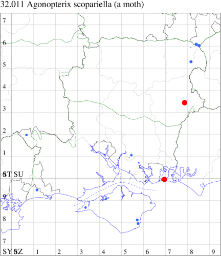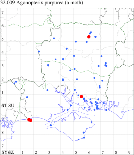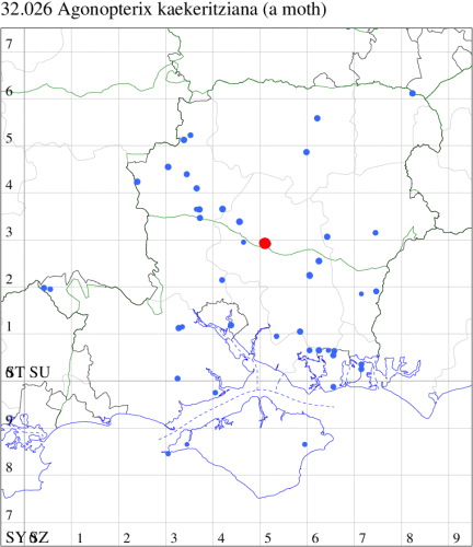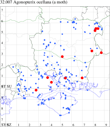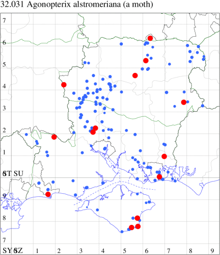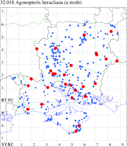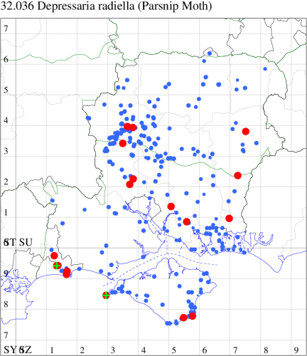 VC11: Woodlands, NF, one, 31 Jul (RBW); Stanbridge Earls, one, 16 Mar (JRM); Romsey, two, 16 Mar (NRJ); Wildern LNR, Hedge End, larva, two, field obs., on Hemlock Water Dropwort, 22 Jun (TCrw); Titchfield Haven NNR, larva, one, field obs., 09 Jun (PBarf); Botley Wood, two, worn, det gen, 15 Mar (F.M.G. det. RJD); Stubbington, larva, two, field obs., in spinnings on Hemlock Water-dropwort, 17 May (DPH); Funtley, two, 10 Feb; four, 14 Feb; four, 15 Feb; four, 16 Mar; one, 07 May; one, 09 May; one, 11 May (TDC); Botley Wood, larva, one, field obs., 16 Jun (DPH); Claylands LNR, Bishop's Waltham, larva, present, field obs., on Hemlock water-dropwort, 31 May; Bishop's Waltham, larva, present, field obs., 08 Jun (DTru); Waterlooville, one, 03 Apr (DWhe); St Clair's Meadow NR, Droxford, larval spinning, present, field obs., spinnings and larvae on hemlock water dropwort, , 03 Jun (RJD); Christchurch: Cross Way, one, 16 Feb; four, 27 Feb; three, 08 Mar; one, 10 Mar; four, 13 Mar; five, 17 Mar; two, 19 Mar; one, 20 Mar; one, 25 Mar (LPyk); Christchurch, three, 07 Apr (APard); Hengistbury Head NNR, one, 28 May (MJef); one, 11 Jul (BKin det. MJef); one, 12 Jul (RPH); Hordle, one, field obs., 14 Mar; Sway, one, 11 Mar; one, 12 Mar; one, 13 Mar; one, 15 Mar; one, 11 Aug; one, indoors, 29 Feb 29 Feb (SKee); Pennington, two, 10 Feb; one, 15 Feb; one, 25 Mar; one, 05 Apr; one, 10 Aug (RFC); Keyhaven Marshes, larva, one, at dusk, larvae in spun flowers of Hemlock Water Dropwort, 08 Jun (WLan);