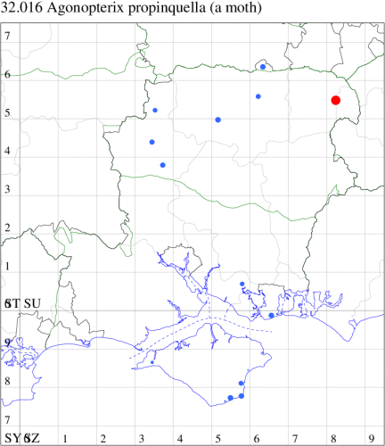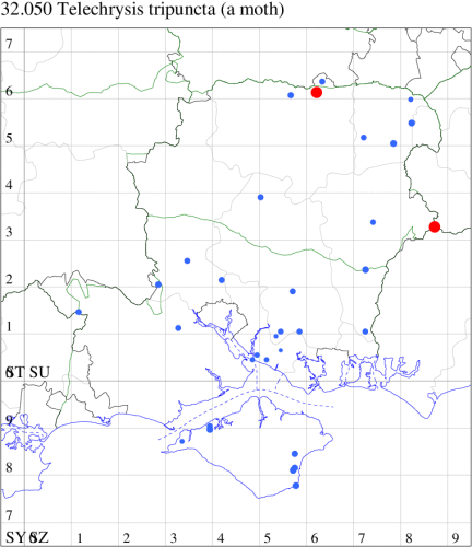 VC11: Funtley, one, 06 Apr (TDC); Hengistbury Head NNR, one, 11 Aug (MoTay det. MJef); Hengistbury Head, two, 30 Jul (MJef); Hengistbury Head NNR, one, field obs., 23 Oct (RPH det. MJef); one, 05 Nov (MJef);