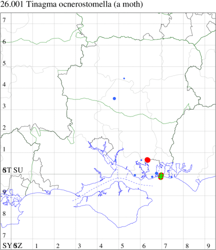 For the maps, all records prior to 2024 are shown by a blue dot (the larger the dot, the more recent), with the current year's records shown in red. As previous records are superimposed on any report for 2024, new sites have greater emphasis (i.e. will show as 'more red').