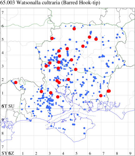 Local in beech woodland throughout England and Wales. Frequent where beech grows in the New Forest and on the chalk in Hampshire and the Isle of Wight, although rare elsewhere in these counties. Wingspan male 26-32 mm, female 30-35 mm. Main confusion species is Oak Hook-tip W. binaria, but smaller and with a broad dark median fascia across the forewing. Larva feeds on Beech, over-wintering as a pupa.