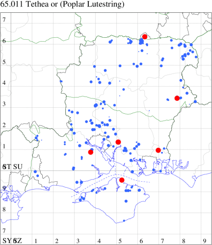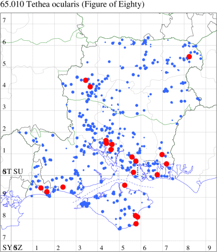 Local in broad-leaved woodland throughout much of southern England and Wales; also in Ireland and Scotland, where represented by different subspecies. In Hampshire and on the Isle of Wight clearly much more local than Figure of Eighty, but found wherever Aspen is established. Wingspan 38-43 mm. The most likely confusion species is Figure of Eighty T. ocularis, which see for differences. Larva feeds on Aspen, over-wintering as a pupa.