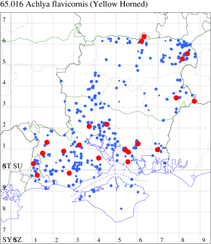 For the maps, all records prior to 2024 are shown by a blue dot (the larger the dot, the more recent), with the current year's records shown in red. As previous records are superimposed on any report for 2024, new sites have greater emphasis (i.e. will show as 'more red').