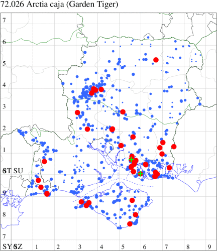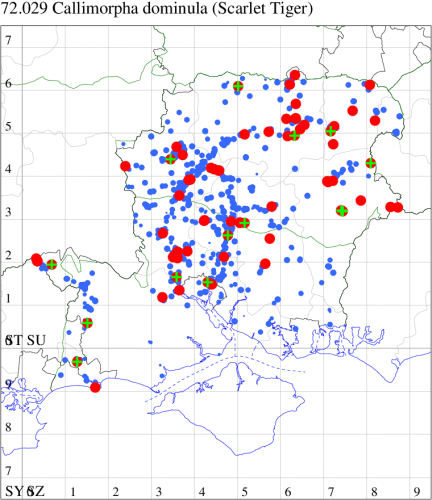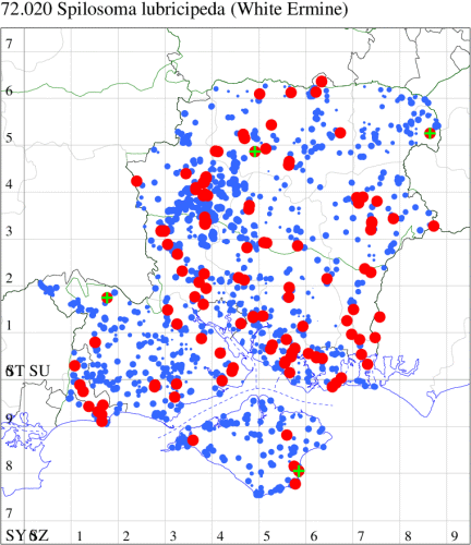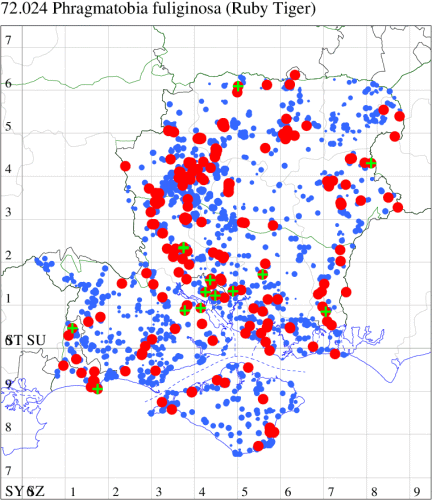 For the maps, all records prior to 2024 are shown by a blue dot (the larger the dot, the more recent), with the current year's records shown in red. As previous records are superimposed on any report for 2024, new sites have greater emphasis (i.e. will show as 'more red').