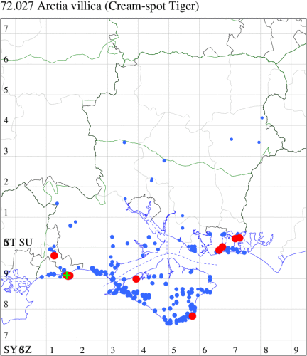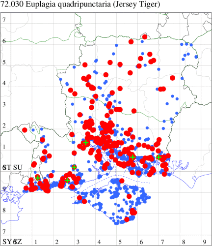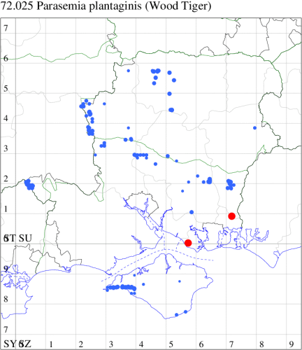 Local on heathland and downland throughout much of the British Isles, but has disappeared from many localities, especially in southern England. In Hampshire and on the Isle of Wight a species that has decreased dramatically through loss of habitat. It is still present on the remaining areas of unspoilt downland. Wingspan 33-42 mm. Sufficiently distinctive not be confused with other more common species of tiger-moth. Larva polyphagous on plants such as Bell Heather, Ribwort Plantain, Greater Plantain, Common Rock-rose, Salad Burnet and Groundsel.