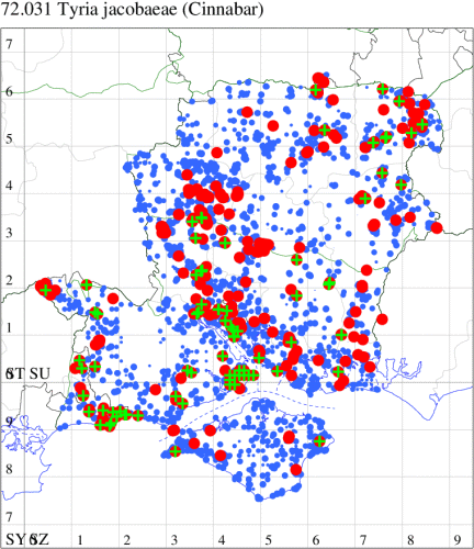 Common on grassland, sand-dunes, heathland, gardens and woodland rides throughout much of England and Wales, rare in Scotland, a species of conservation concern under the UK Biodiversity Action Plan. In Hampshire and on the Isle of Wight widespread and usually common, especially in the larval stage, on dunes, downs, open woodland and other places where the foodplant grows. Wingspan 35-45 mm. Unmistakable. Larva feeds on Common Ragwort, occasionally also on Oxford Ragwort, over-wintering as a pupa.