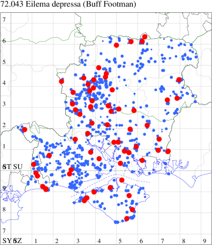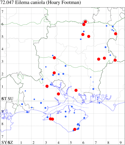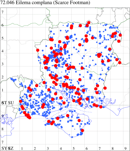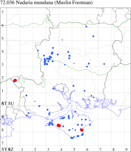 Nationally scarce (Nb) on sea cliffs and shingle beaches, and inland on quarries, from Kent to Anglesey. In Hampshire and on the Isle of Wight first recorded on the Island in 1992 and, on the mainland, in 1997, now increasingly seen in the north-east of the county where it is spreading from the east. Wingspan 28-35 mm. Very similar to Scarce Footman E. complana, but hindwing very pale yellowish grey (ochreous yellow in Scarce Footman), a feature which is difficult to see on live specimens. Larva feeds on various lichens, often on rocks.