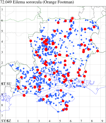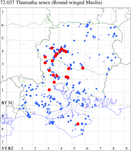 VC11: Earliest: Mill Copse, St Leonards, Hurn, 05 Apr, 1 (MJef) Latest: Lyndhurst, NF, 04 Sep, 1 (CBen) Max count: Swaythling, Southampton, 10 Aug, 28 (MEdg)