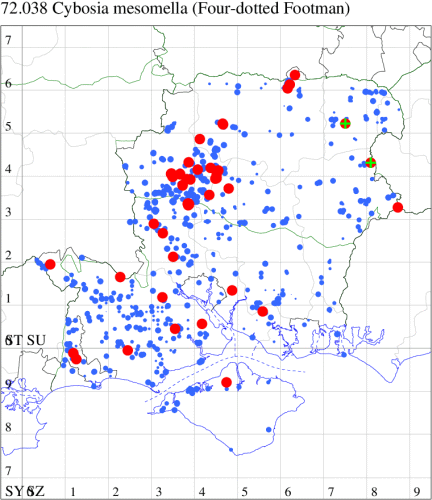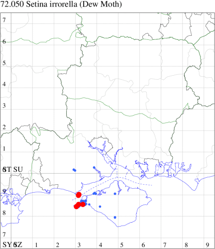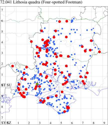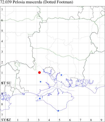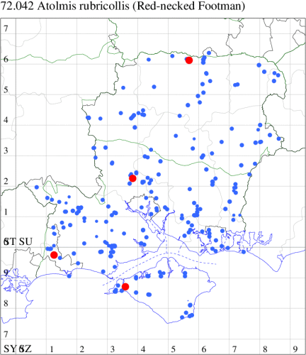A rare Red Data Book species, possibly now only breeding in Britain in fens and damp woodland in the Norfolk Broads, but recorded in a number of other locations, where sometimes considered to be a migrant. In Hampshire following a gap of 107 years, 2008 saw two reports in the New Forest, with further scattered reports of presumed migrants from elsewhere in the Forest, and Botley Wood, and the first for the Island in 2018 (and again in 2021). Wingspan 30-34 mm. The most likely confusion species is Small Dotted Footman P. obtusa, which is smaller, has more rounded wings and a very curved median row of black dots from costa to dorsum (MBGBI Vol 9). Larva feeds on various lichens.