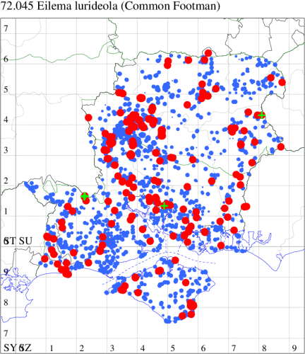 Common wherever there are lichens, in gardens, farmland, marshes and woodland throughout England, Wales and southern Scotland. Widespread and common in Hampshire and on the Isle of Wight. Wingspan 31-38 mm. Wing-shape and posture of live specimens is a far more reliable way of separating the various Eilema species than examination of prepared specimens, and familiarity with E. lurideola is the key to the identification of the other Eilema species; the most likely confusion species is Dingy Footman E. griseola, which see. Larva feeds mainly on various lichens, perhaps also on the foliage of various trees and bushes, including Hawthorn and Dogwood.