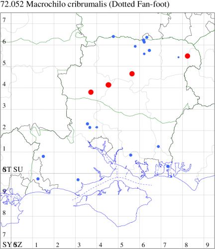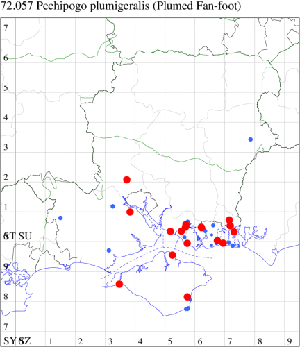 Nationally scarce (Na) in ancient deciduous woodland in parts of southern England, a priority species under the UK Biodiversity Action Plan. Still found in a few localities in its previous range which included most of England south of the Humber and parts of Wales. In Hampshire its decline mirrored the national trend and until recently was only reliably found in Pamber Forest, but in recent years has been found to have a relatively strong population in the Harewood Forest area. The only modern record from the Isle of Wight was a strong count of 22 in Parkhurst Forest in June 1988: it is therefore rather mystifying why it hasn't been reported from there since. Wingspan 32-34 mm. The most likely confusion species is the rare immigrant Jubilee Fan-foot Zanclognatha lunalis, which see for differences. Larva feeds on Pedunculate Oak.