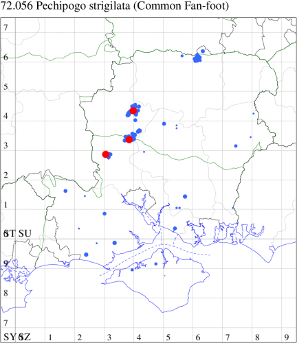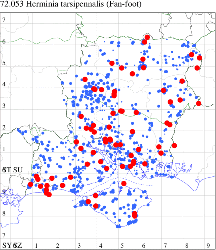 Common in broad-leaved woodland, hedgerows and gardens throughout the British Isles. Widespread and common in Hampshire and on the Isle of Wight. Wingspan 31-33 mm. The most likely confusion species is Common Fan-foot Pechipogo strigilata, a rare and declining species, despite the name, which is paler and less deeply coloured, with fainter, less well-defined cross-lines; by comparison Z. tarsipennalis is a rich, deep brown, with dark, almost black, cross-lines. The current species is often mis-reported as the 'common' fan-foot, so please take care on record entry.