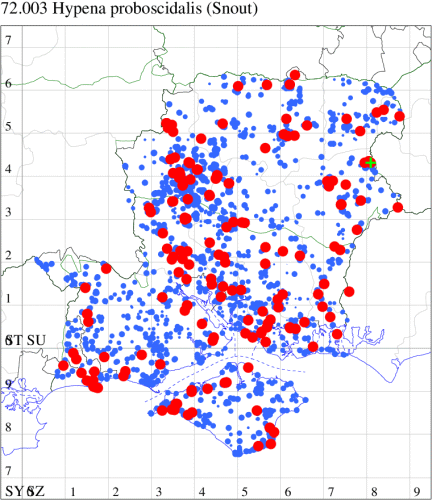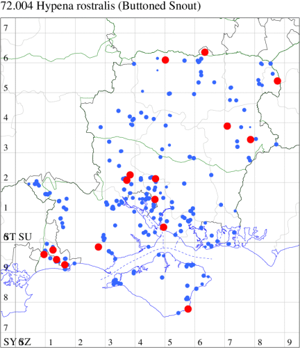 Nationally scarce (Nb) in hedgerows, woodland edges and gardens throughout much of south-eastern England, and a priority species under the UK Biodiversity Action Plan. In Hampshire and on the Isle of Wight very local, but since 1990 there does appear to have been an increase in the numbers reported, with a peak of 44 records in 2001. Wingspan 29-32 mm. The main confusion species is Bloxworth Snout H. obsitalis, which has the forewing more pointed and broader, with a conspicuous white patch below the costa outside the median fascia, followed by horizontal dashes (MBGBI Vol 10). Larva feeds on Hop.