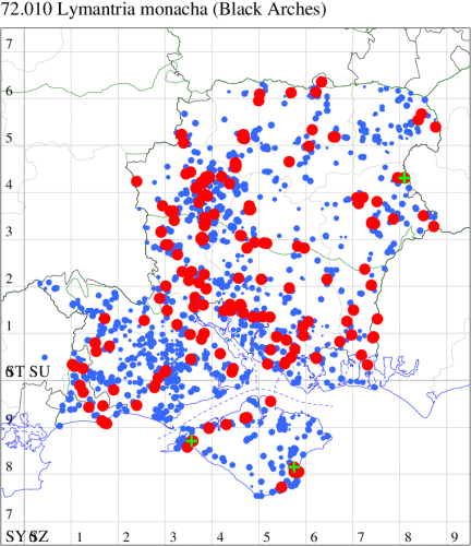 For the maps, all records prior to 2024 are shown by a blue dot (the larger the dot, the more recent), with the current year's records shown in red. As previous records are superimposed on any report for 2024, new sites have greater emphasis (i.e. will show as 'more red').