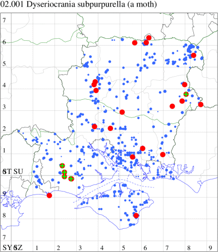 For the maps, all records prior to 2024 are shown by a blue dot (the larger the dot, the more recent), with the current year's records shown in red. As previous records are superimposed on any report for 2024, new sites have greater emphasis (i.e. will show as 'more red').
