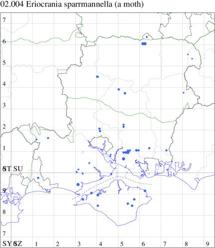 Common in birch woodland throughout the British Isles. Fairly widely distributed in Hampshire and on the Isle of Wight, where it is the most common of the six birch feeding Eriocrania species. Wingspan 9-14 mm. Day-flying. Very similar to E. sangii, from which separated only by dissection of the genitalia. Larva mines leaves of Birch, over-wintering as a pupa.