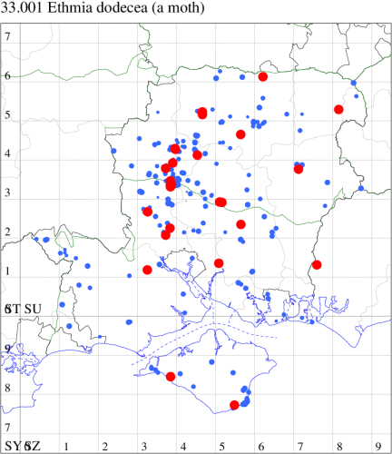 For the maps, all records prior to 2024 are shown by a blue dot (the larger the dot, the more recent), with the current year's records shown in red. As previous records are superimposed on any report for 2024, new sites have greater emphasis (i.e. will show as 'more red').