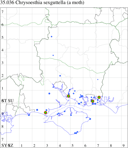 For the maps, all records prior to 2024 are shown by a blue dot (the larger the dot, the more recent), with the current year's records shown in red. As previous records are superimposed on any report for 2024, new sites have greater emphasis (i.e. will show as 'more red').
