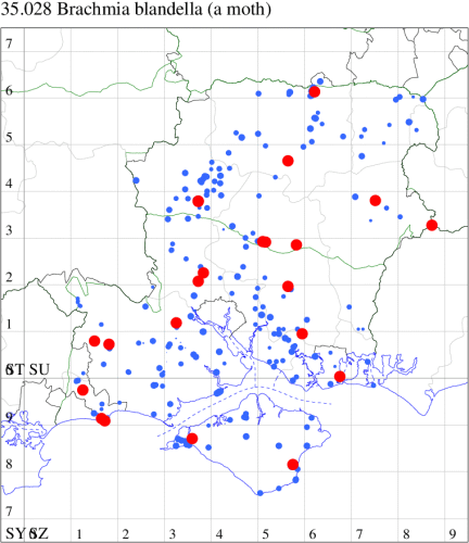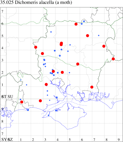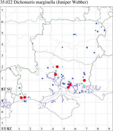 For the maps, all records prior to 2024 are shown by a blue dot (the larger the dot, the more recent), with the current year's records shown in red. As previous records are superimposed on any report for 2024, new sites have greater emphasis (i.e. will show as 'more red').