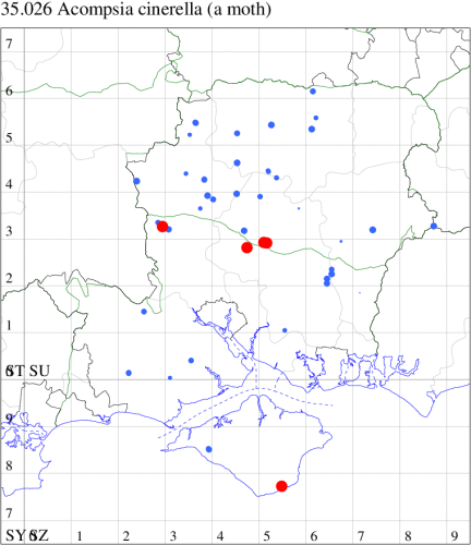 Nationally scarce (Nb) on chalk and limestone downland and roadside verges in southern England and south Wales. Restricted in Hampshire to sites such as Old Winchester, Portsdown and Magdalen Hill Down, and on Isle of Wight to a single site near Ventnor; claims from other areas of the county should be accompanied by photographic or other evidence. Wingspan 15-17 mm. Larva feeds on Wild Marjoram, living within a spun or rolled leaf.