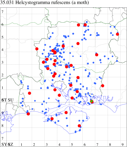 VC11: Linford Bottom, one, 05 Aug (CLew); East Tytherley, one, 27 Jul (GCE); Marchwood, one, 23 Jul (CTha); Mottisfont, one, 16 Jul (TSto); Romsey, one, 28 Aug (MJB); one, 23 Jul (NRJ); Broughton, one, 29 Jul; Ashley, one, 13 Jul; Little Somborne, one, 09 Aug (GCE); Dibden Purlieu, NF, one, 20 Jul (RAC); Winchester, one, 19 Jul (THW); Brownwich Cliffs, Titchfield, one, 26 Jul (F.M.G.); Funtley, one, 03 Jul; two, 23 Jul (TDC); Botley, one, 18 Jul; one, 25 Jul; two, 26 Jul; one, 28 Jul; one, 01 Aug; one, 11 Jul; two, 19 Jul; one, 23 Jul; one, 26 Jul; two, 28 Jul; one, 30 Jul (SLB); Dean, Bishop's Waltham, present, 22 Jul (CMor); Milton Common, larva, one, field obs., 02 Aug (DCook det. IPar); Portsmouth, one, 03 Jun (IRT); South Holt Farm, NF, one, 12 Jul (CGree det. OHen); Hengistbury Head, one, 18 Jul (MJef);