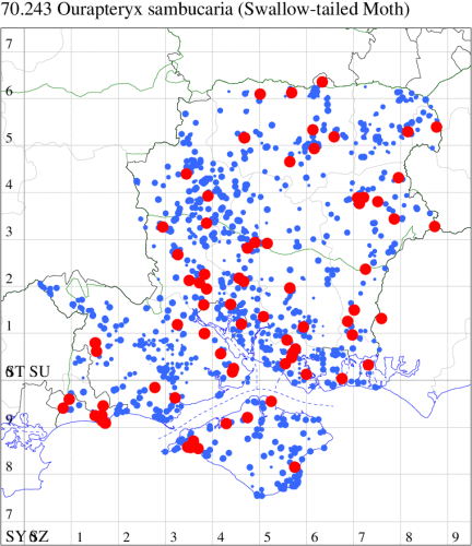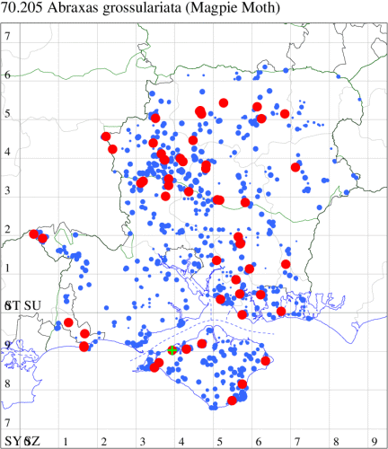 Common on moorland, in gardens and allotments throughout much of the British Isles. In Hampshire and on the Isle of Wight widespread, but far less common than in the past - it used to be a common garden moth throughout the region. Wingspan 42-48 mm. Unmistakable. Larva feeds on Heather, Blackthorn, Hawthorn, Hazel, Black Currant, Red Currant, Gooseberry and Spindle.