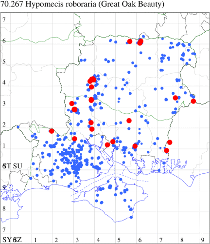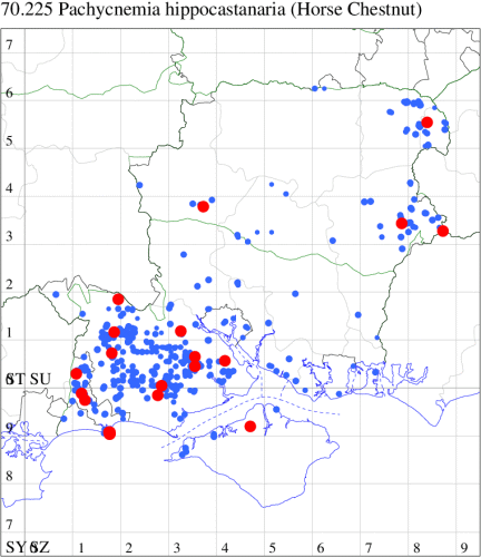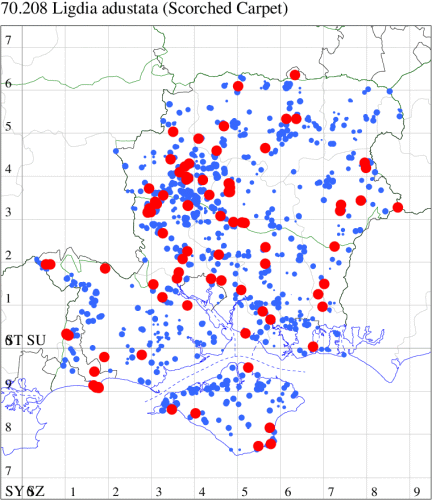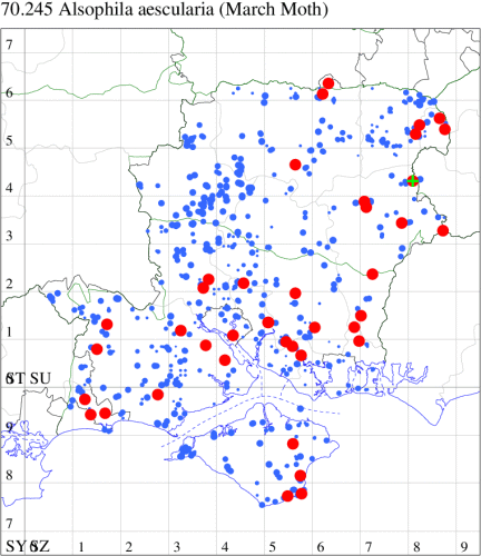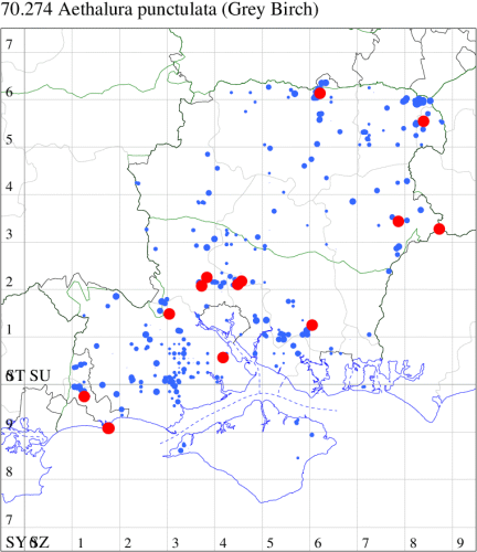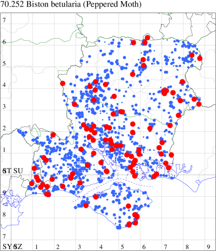 For the maps, all records prior to 2024 are shown by a blue dot (the larger the dot, the more recent), with the current year's records shown in red. As previous records are superimposed on any report for 2024, new sites have greater emphasis (i.e. will show as 'more red').