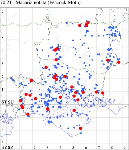Common in coniferous woodland, plantations and gardens throughout the British Isles. Widespread and common in Hampshire and on the Isle of Wight. Wingspan 28-34 mm. Worn specimens could be misidentified as Dusky Peacock M. signaria, an extremely rare immigrant, which see. Larva feeds on various coniferous trees, including Scots Pine and Norway Spruce, over-wintering as a pupa.