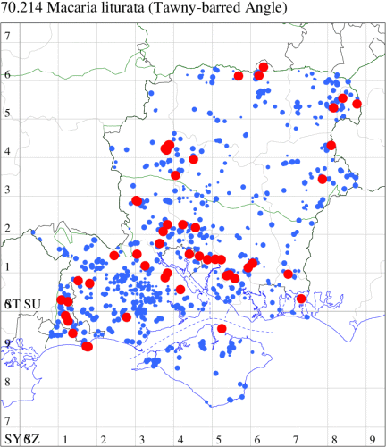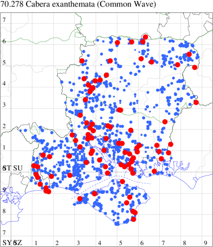 Common in woodland, scrub and gardens throughout the British Isles. Widespread and common in Hampshire and on the Isle of Wight. Wingspan 32-35 mm. The main confusion species is Common Wave C. exanthemata, in which cross-lines are brown and curved. Larva feeds on Downy and Silver Birch, Alder and Sallow, over-wintering as a pupa.